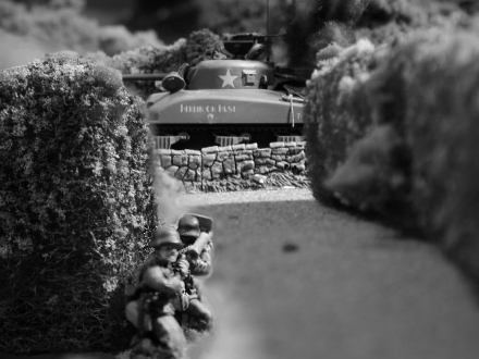 After destroying this "Sherman" the team fired and missed a second "Sherman" just left of this one. How ever the several of the "American" members had spotted the smoke trails from the "schreck" team and started to put suppressive fire on them causing them to retire back to German lines.