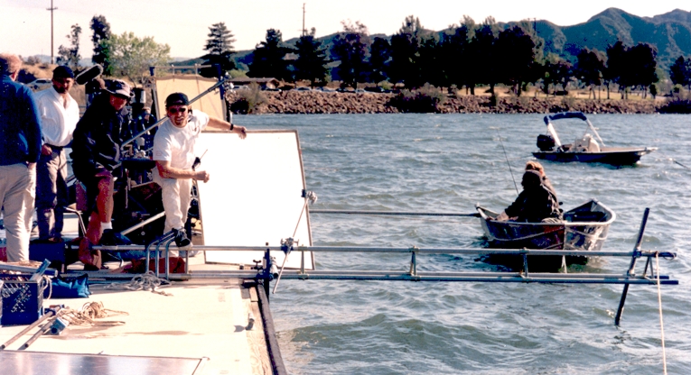 This was the infamous Bass fishing episode on Arliss. It was a very tough day for the grips as it fell to us to do all the boat wrangling and rigging. The wind was coming up at this point and got to the point later of foot tall white caps! This was all done at the lower lagoon at Castaic lake. Teddy holds a 4 by. I think there are still some sand bags down on the bottom.....