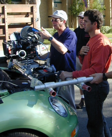 Jim Conway (Director-Producer) and Noon Orsati (Stunt Co-ord) look over a Camera mount I put on a new VW prior to a stunt.