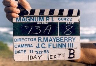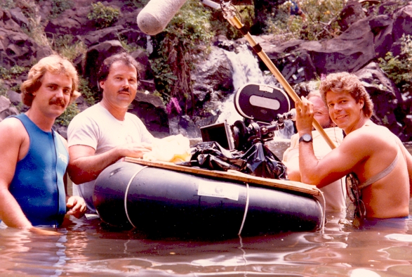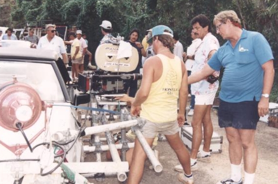 This was one of my first episodes on Magnum, awesome! That is real not a set behind me! This is a series of waterfalls and pools just off the "Pali" highway. Bill Witthans (Dolly grip / me!) Pat McGinnis (1st AC) Greg Navvee (Boom man) and operator Phil Kaplan behind him.