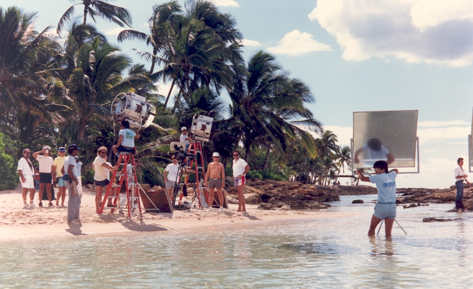 Out near Paradise cove Denny Hall (AC) and Pat McGinnis are in the center right of Camera. Rob McCarthy (BB electric) to the left of camera sorta hidden, and Mark Kuromoto (grip) on the shiny board. I think this was one of first time mark was with us. There are few places better to work than this!