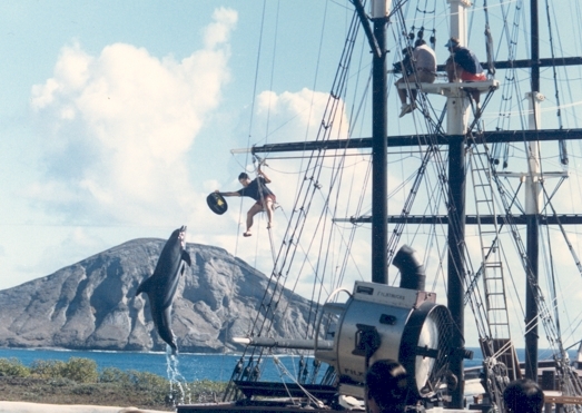 Another early episode that had scenes done in Sealife park. That's Phil Kaplan (op) and the first years Key Grip Tommy Thompson up with a hand held camera in the rigging. Rabbit Island is the big mountain in background.