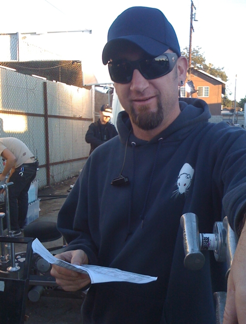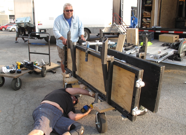 Just what does the rigging crew do when you never see them? My best boy Leonard LaRosa (under cart) gets a hand from our 10 ton driver Bob Guimelo. We built a cart to make transporting the Pod car Platforms faster and easier as they weighed about 100 pounds each and there were four of them. Making things fast and simple is the name of the game. This cart allowed the whole pod car package to be loaded easily from truck to truck and then to where ever we were rigging the cars.