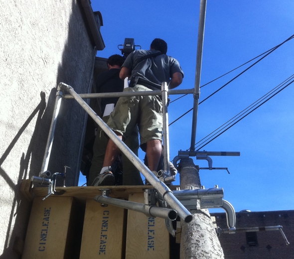 What riggers / grips do.... extension of walkway on second floor apartment to give room for hand held shot. Cameron Duncun (cam on shoulder) and 1st AC Dominic Bartalone use it all.