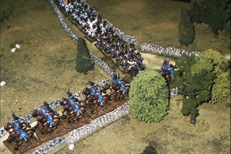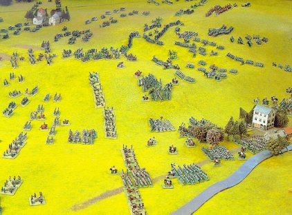 The miniature soldiers or vehicles are mounted on trays for ease of movement. These movement stands are often decorated with model turf or grass and are cut to an exact scale frontage representing the precise space the forces depicted would occupy historically. The trays themselves can then be aligned to represent specific historical battle formations and units. Thus the trays could be formed together to recreate the basic historical unit represented in the rules being played, such as a battalion of infantry in Empire, a game about the Napoleonic Wars. The unit could also be a full brigade as in Napoleon’s Battles, a set of rules on the same period that allows larger battles to be easily played. The trays could then be deployed to represent the different combat formations a battalion could take, such as column, line or square. If done properly in conjunction with a well designed terrain table, these soldiers present an historically accurate and colorful spectacle unsurpassed by even the most modern computer wargames.